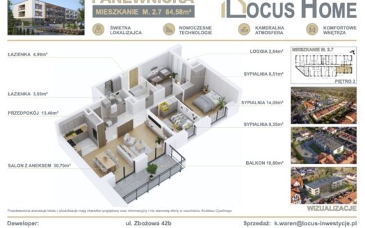 Cena w ogłoszeniu dotyczy mieszkania czteropokojowego na drugim piętrze budynku: M 2.7 – 84,58 m² – 799.281 zł ZAPRASZAMY na stronę: https://locus-i ...