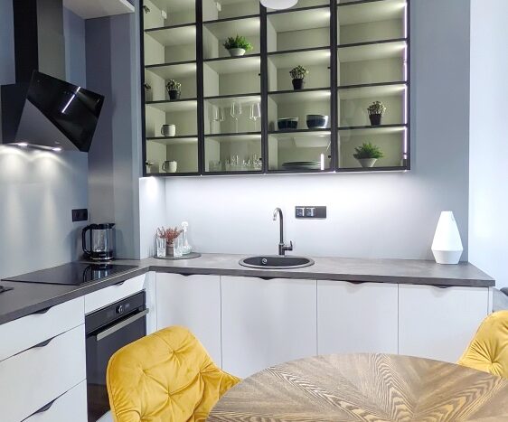W projekcie zastosowano wiele źródeł światła. Przy wejściu, po prawej stronie, znajduje się mocne światło – 2-metrowa lampa LED. W szafach zainstalowano podświetlenie LED, co dodaje funkcjonalności.