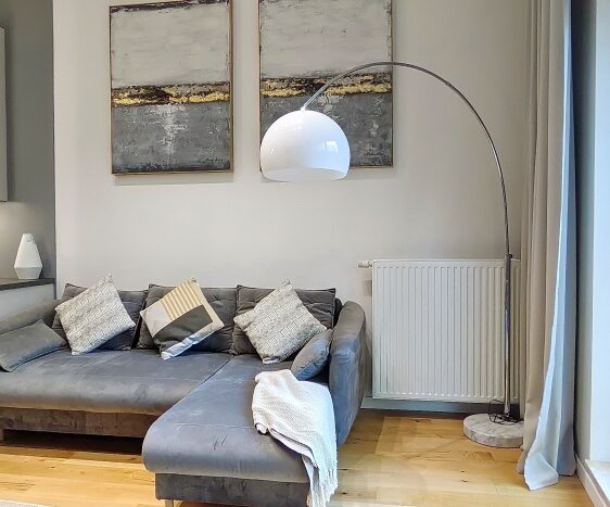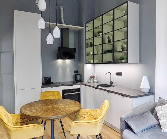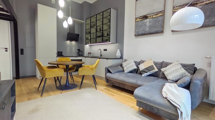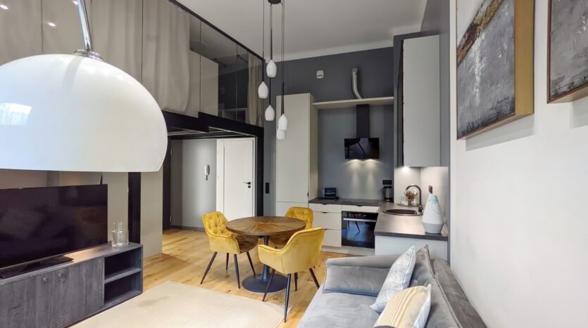 Lokal został urządzony w nowoczesnym stylu. Ze względu na wysokość sufitu 3,8m powstała dodatkowa powierzchnia z antresolą 12 m2,( wysokość 168m) która stanowi dodatkową przestrzeń w postaci sypialni i garderoby. Antresola została częściowo przeszklona i wyposażona w zasłony, które zapewnią Ci więcej intymności.