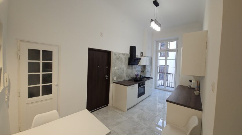 Dużym atutem nieruchomości są dwa niezależne wejścia: od frontu kamienicy do przedpokoju oraz od oficyny bezpośrednio do kuchni. To wygodne rozwiązanie na co dzień — szczególnie po powrocie z zakupów — a jednocześnie dodatkowy atut, jeśli mieszkanie miałoby pełnić również funkcję biura, kancelarii lub gabinetu.