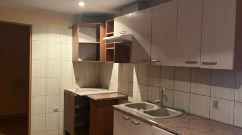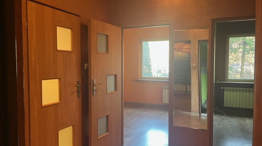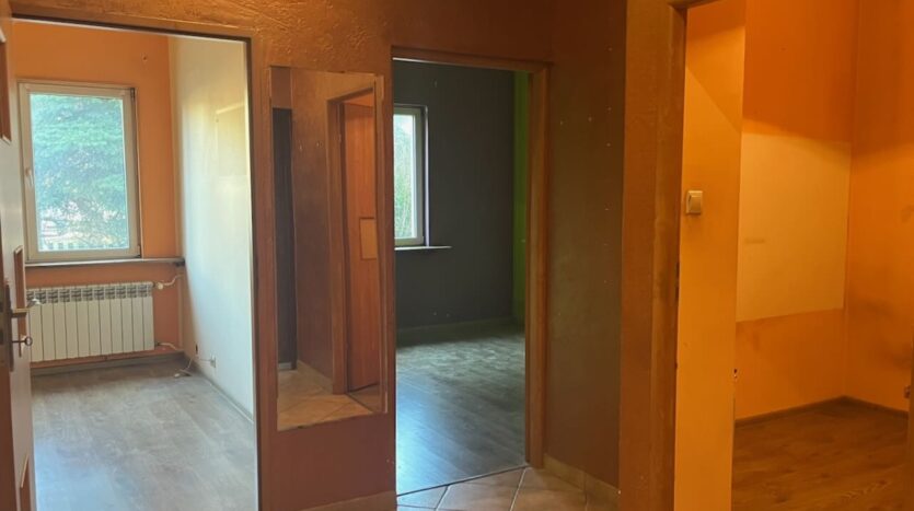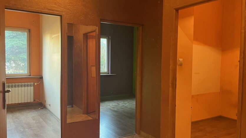 Mieszkanie do remontu na parterze budynku z bardzo łatwym dostępem dla osób niepełnosprawnych. Powierzchnia mieszkalna to 60m2, na które składają się kuchnia ze spiżarnią, przedpokój, łazienka i obecnie trzy pokoje. Pierwotnie mieszkanie było dwupokojowe lecz jeden z pokoi został podzielony na dwa (jeden bez okna służył jako duża garderoba). Ściankę działową można w łatwy sposób usunąć. Oglądanie możliwe każdego dnia.