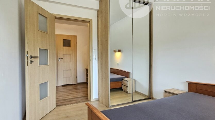 Sypialnia – ustawna, z dużą szafą przesuwną; możliwość pozostawienia łóżka i mebli.