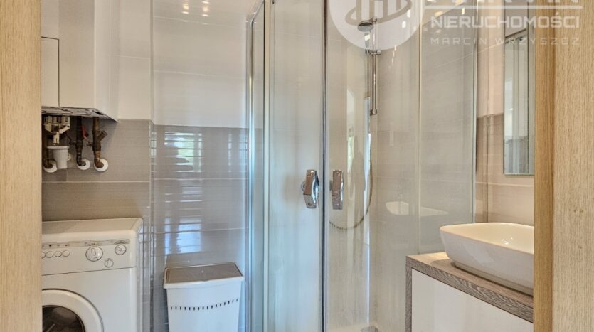 Łazienka – z kabiną prysznicową, umywalką, pralką, szafką, lustrem i WC.