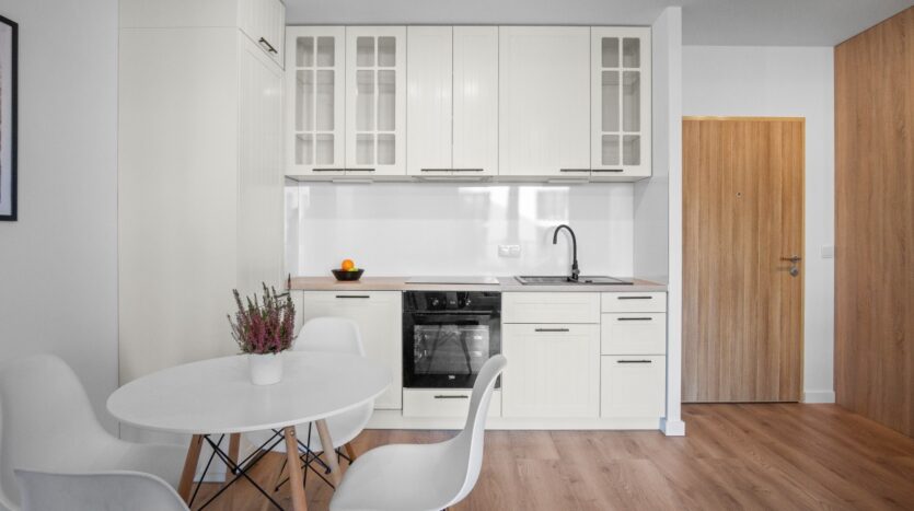 salon z aneksem kuchennym wyposażonym w płytę indukcyjną, piekarnik, zmywarkę i okap
