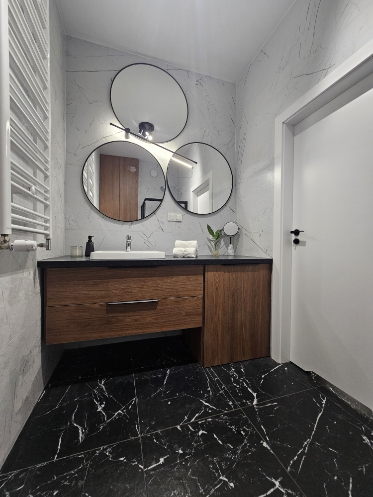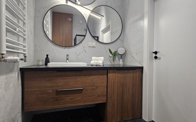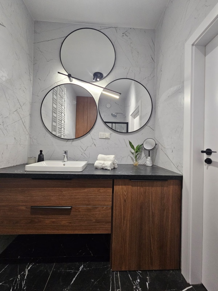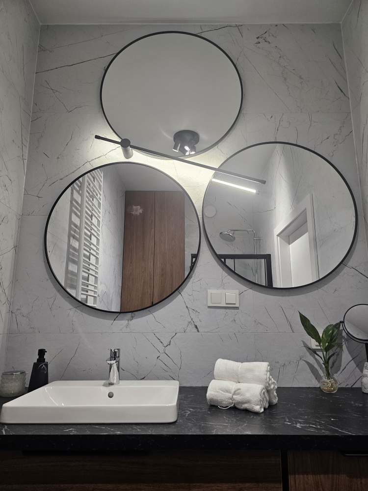 W łazience zabudowy na wymiar – geberitu oraz umywalki z pralką Whirpool – dają dużo miejsca do przechowywania, a trzy duże lustra o średnicy 80 cm każde potęgują wrażenie przestrzeni.