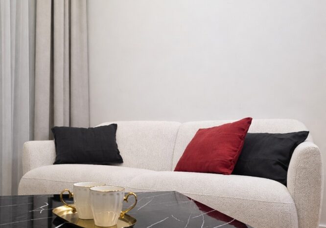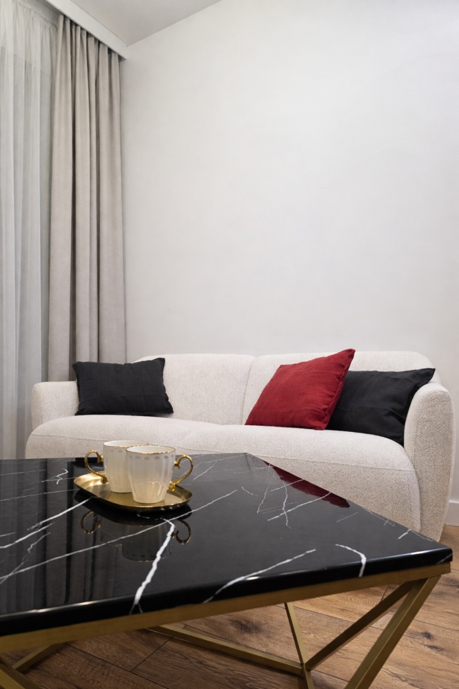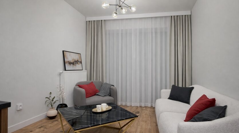 Mieszkanie obejmuje pełną zabudowę meblową w kuchni, przedpokoju oraz w łazience oraz starannie dobrane elementy wyposażenia.W salonie znajdują się designerskie meble, m. in. Sofa marki Gautier o nowoczesnym wzornictwie, dopasowane do charakteru wnętrza.