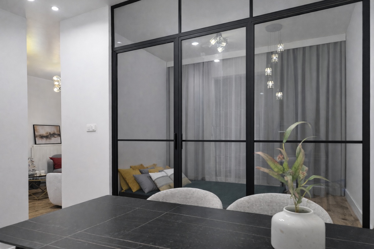 Ponadstandardowa wysokość pomieszczeń (3 metry) zapewnia poczucie przestrzeni i bardzo dobre doświetlenie wnętrza. Duże okna dodatkowo potęgują efekt przestronności i zapewniają dużo naturalnego światła przez cały dzień. Przeszklona ściana nadaje mieszkaniu nowoczesny, loftowy charakter.