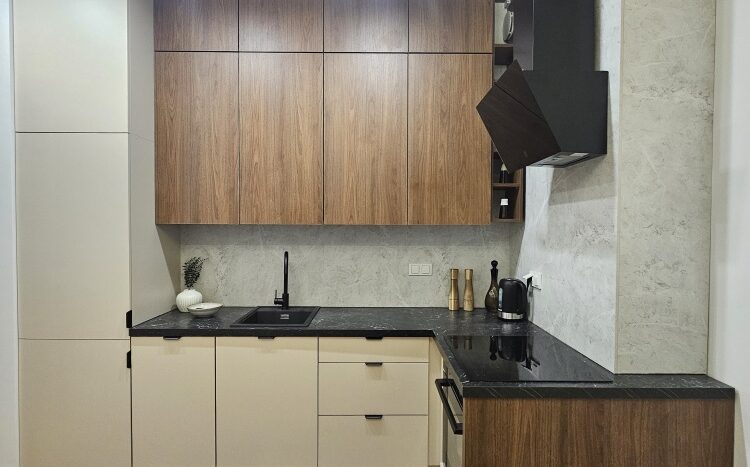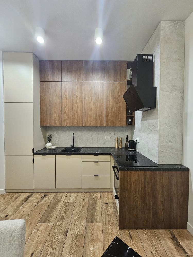 W całym mieszkaniu zastosowano spójną, naturalną kolorystykę premium w odcieniach ciepłego drewna, beżu i grafitu, tworząc harmonijne i ponadczasowe wnętrze.