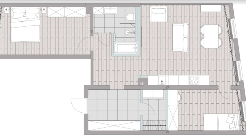 Dla rodziny 2+1 lub 2+2 – dwie sypialnie, a przestrzeń dzienna jest duża i ustawna.