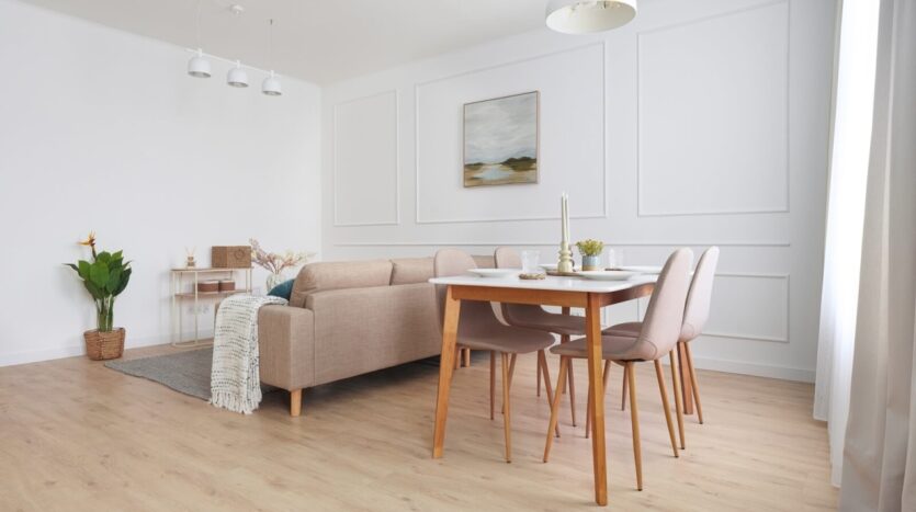 przestronnego salonu z aneksem kuchennym, z miejscem na część wypoczynkową i jadalnianą,