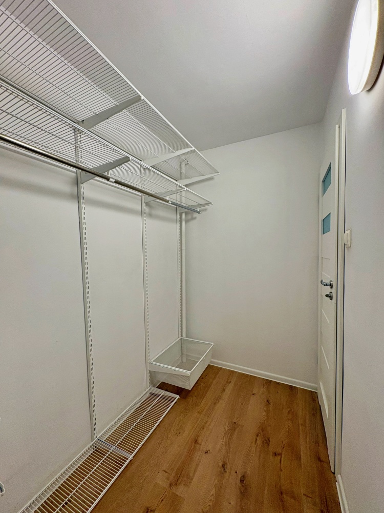 Z okien i balkonu rozciąga się otwarty widok zapewniający poczucie przestrzeni, światła i prywatności — rzadko spotykane w nowej zabudowie tej części miasta.