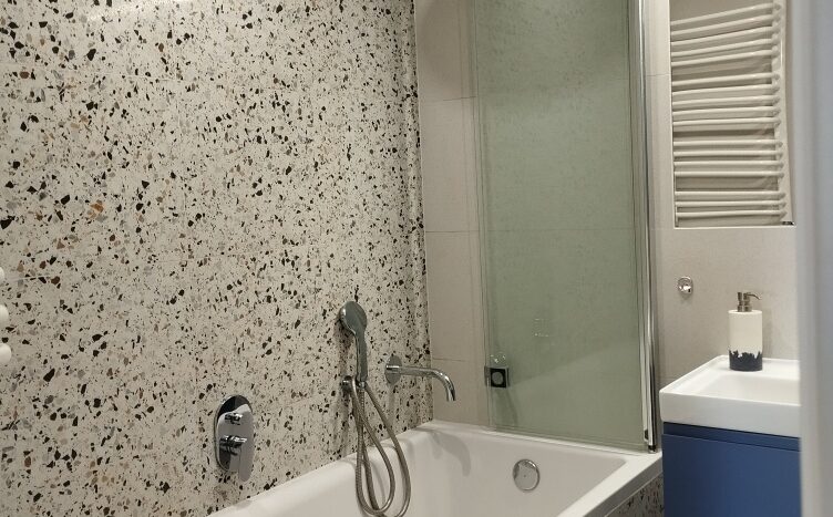 Łazienka: Duża, z wanną i składanym parawanem prysznicowym oraz zabudową meblową.