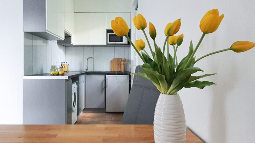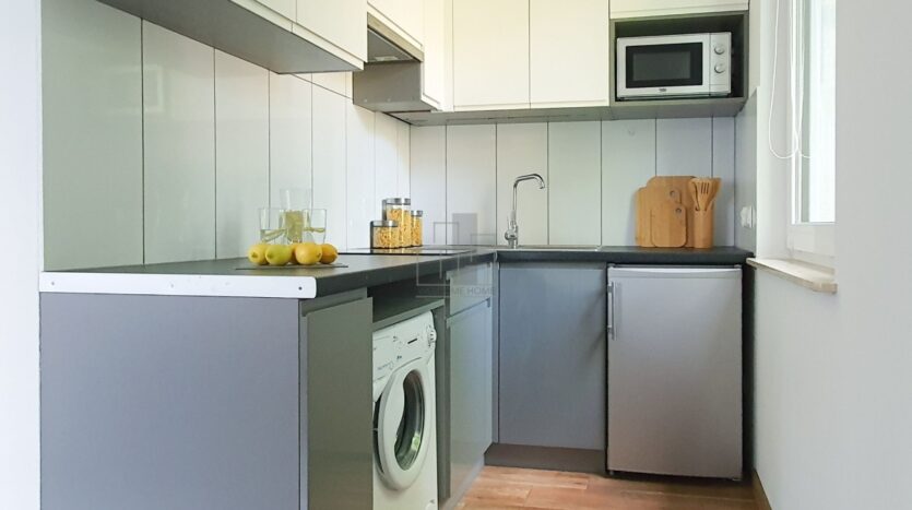 Kuchnia wyposażona w lodówkę, mikrofalówkę, płytę indukcyjną, okap, pralkę.