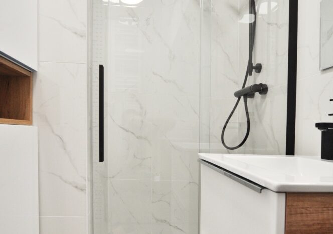 – łazienka w nowoczesnym wykończeniu: duża kabina prysznicowa, deszczownica, czarna armatura, zabudowa meblowa, pralka