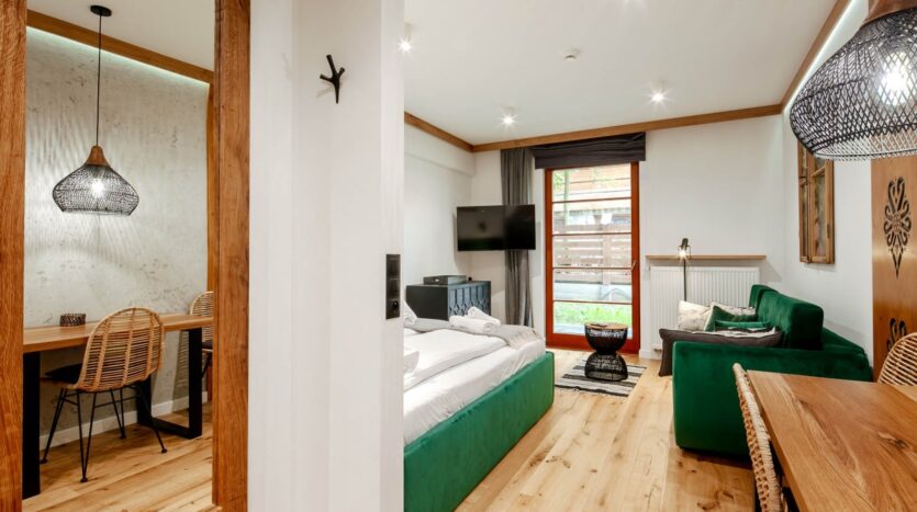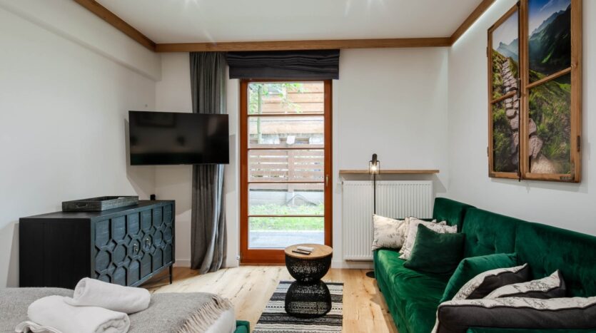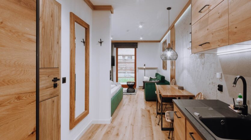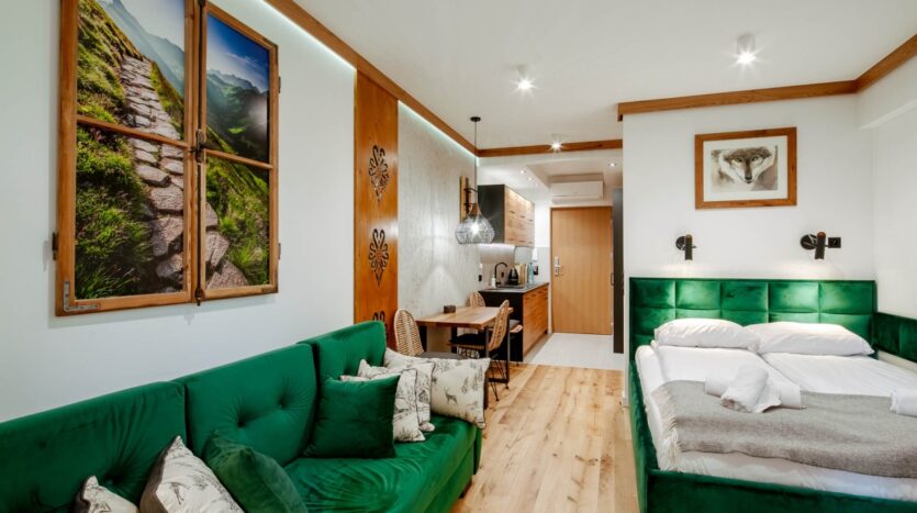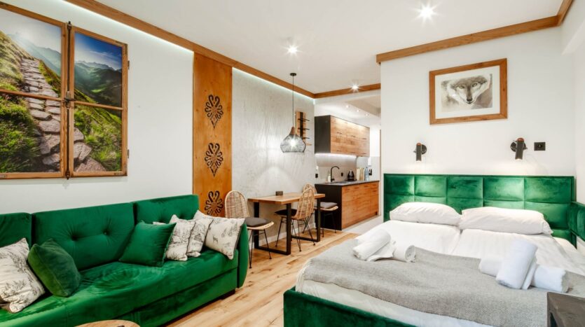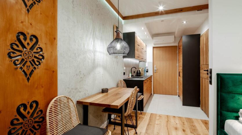Apartament inwestycyjny zlokalizowany w bliskim sąsiedztwie kompleksu skoczni narciarskich, terenów rekreacyjnych, atrakcji turystycznych, ale także słynnych Krupówek, które znajdują się w odległości ok. 800m od budynku! Jest to świetne miejsce zarówno dla osób, które chcą korzystać z bliskości centrum i uroków miasta, jak i tych dla których najważniejsza jest bliskość szlaków turystycznych i bazy wypadowej dla górskich wędrówek po Tatrach. Apartament zlokalizowany w budynku w którym znajduje się STREFA SPA z saunami i jacuzzi, a także duży zewnętrzny parking. W samym budynku jest winda.
