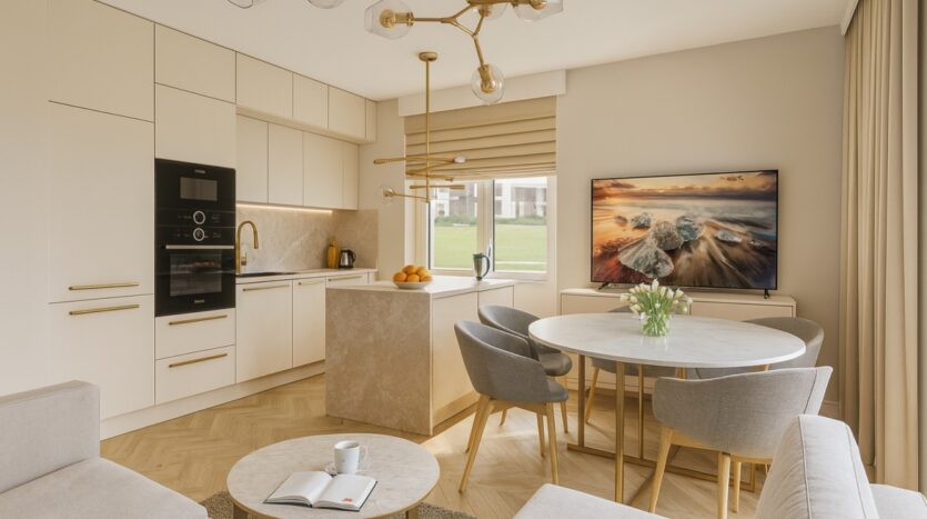 Apartament jest zlokalizowany w nowoczesnym budynku o wysokim standardzie wykończenia.