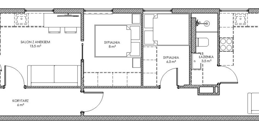 Mieszkanie ma powierzchnię 67,12 m2, stan deweloperski.