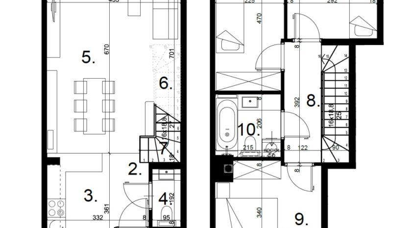 – Podzielone na dwie strefy: na dole duży, przestronny salon z otwartą kuchnią, toaleta. Na górze strefa prywatna z 3 sypialniami i łazienką.