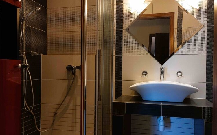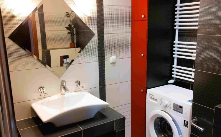 – łazienka z kabiną prysznicową typu walk-in, WC, umywalką i pralką (4,7 m2).