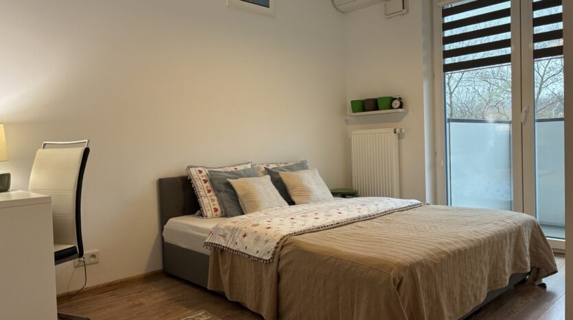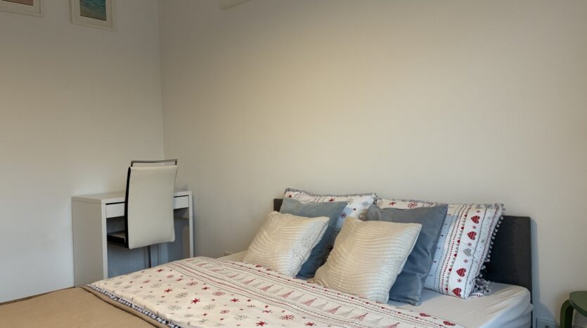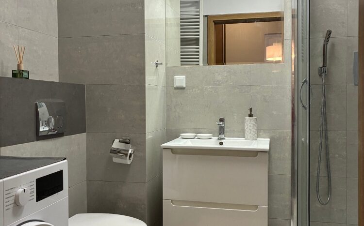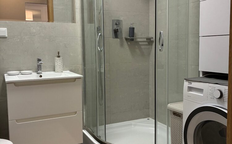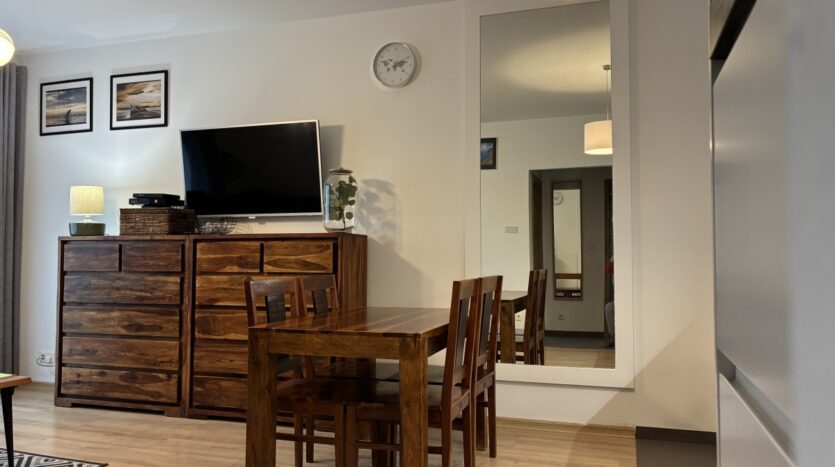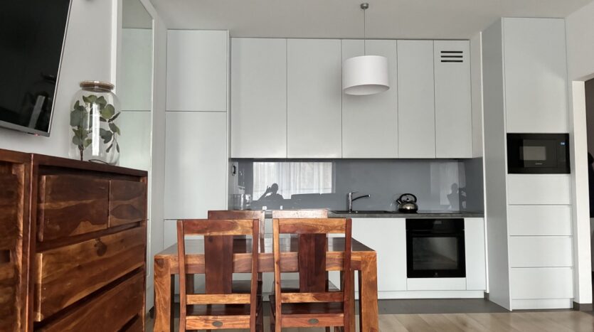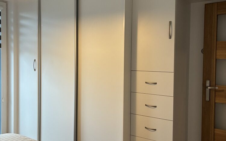 – The apartment is fully furnished and was designed for the owner’s own use, with great attention to the quality of materials and functionality of the space. Custom-made furniture maximizes the usable area. New kitchen furniture, high-class household AGD, wooden furniture (table, chairs), additionally a sofa, armchair, chests of drawers, and TV. The bathroom features a new shower, washing machine, and automatic dryer. The bedroom has a custom-made wardrobe and a new double bed. The apartment is equipped with high-quality air conditioning in both the living room and the bedroom. A large terrace is accessible from both the living room and the bedroom.