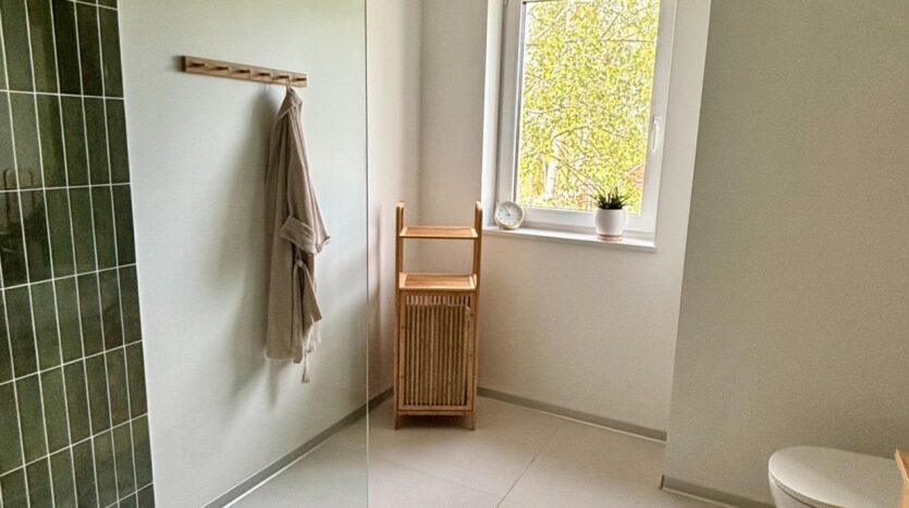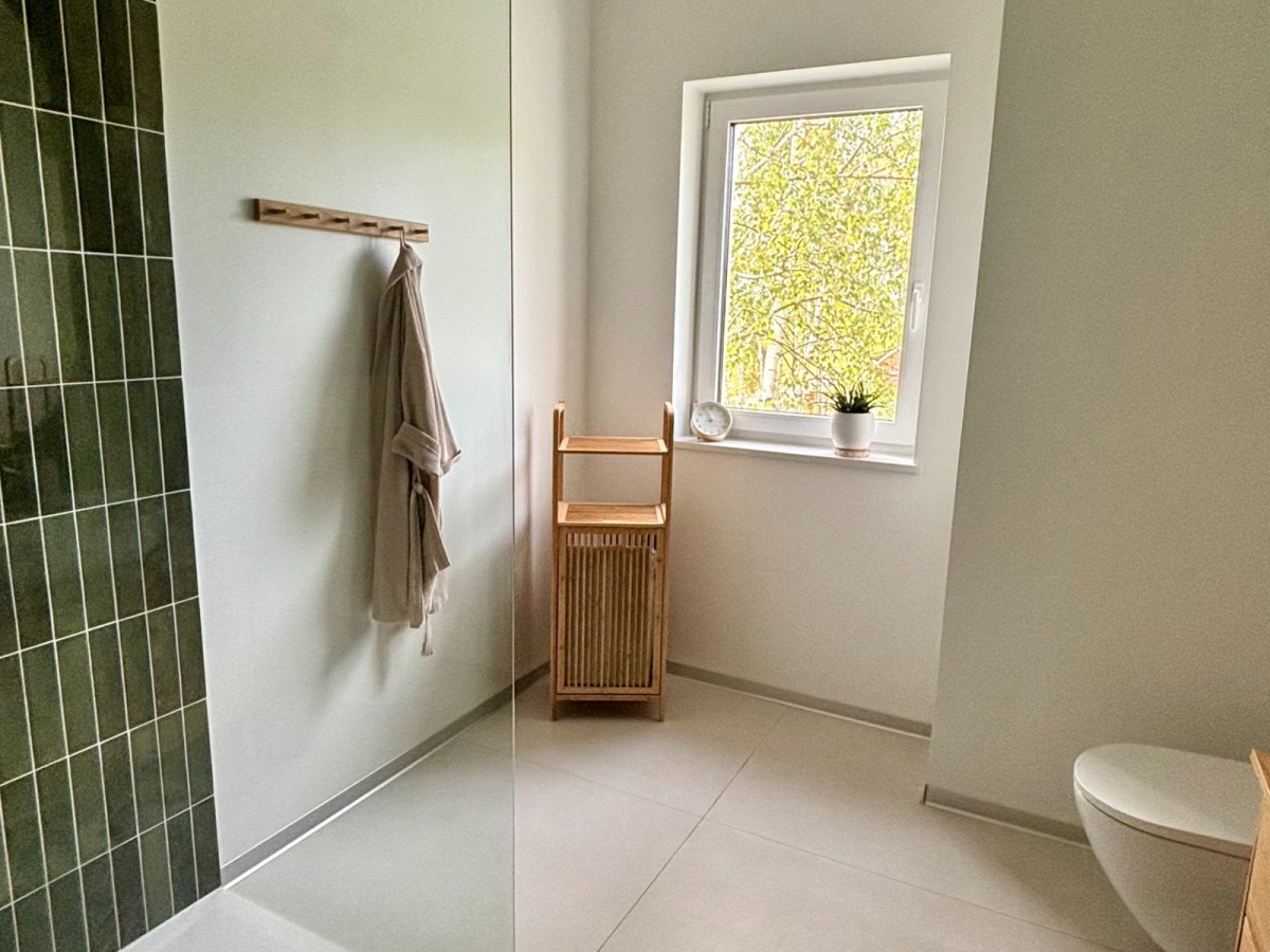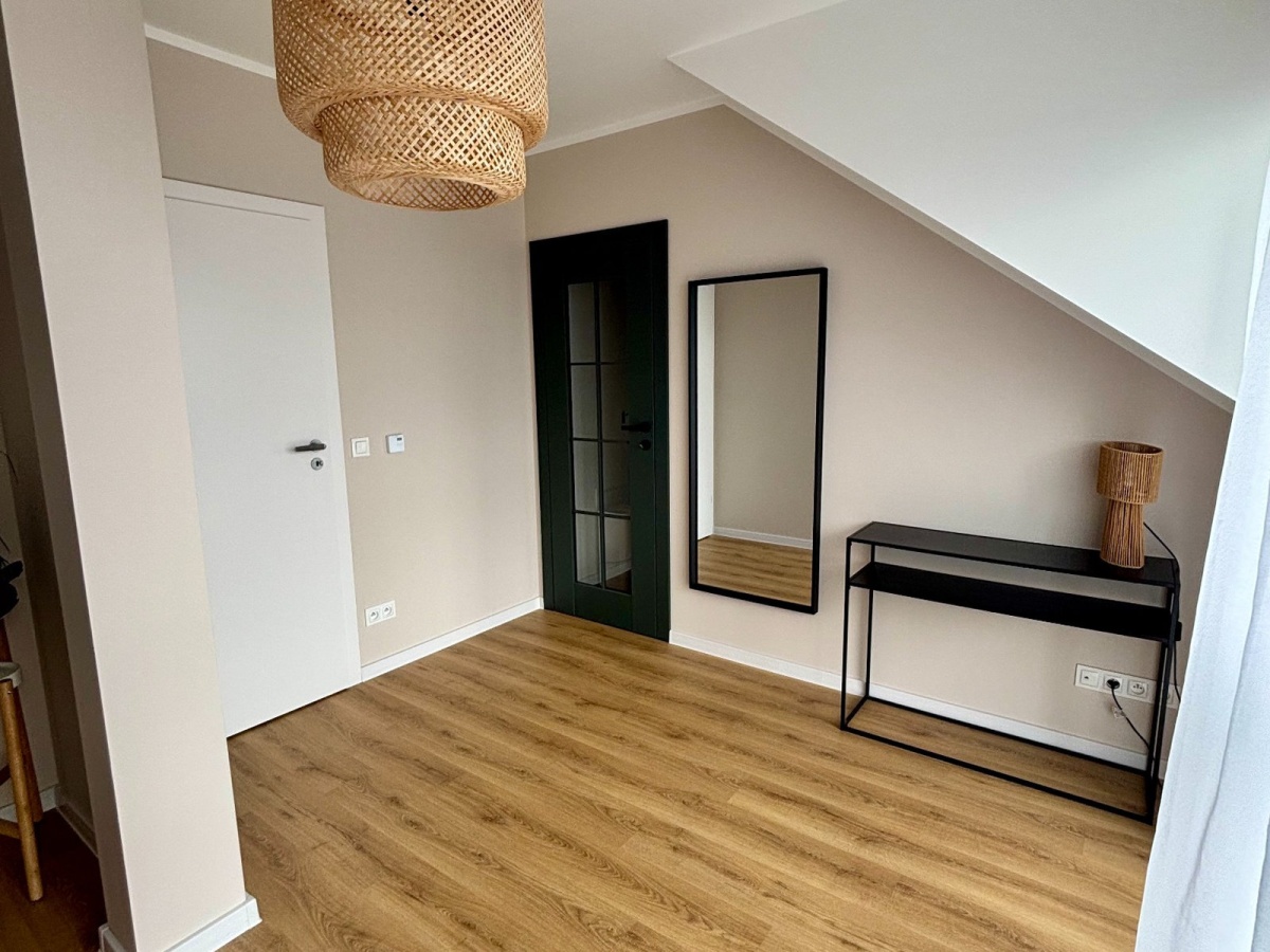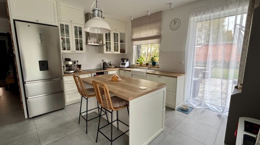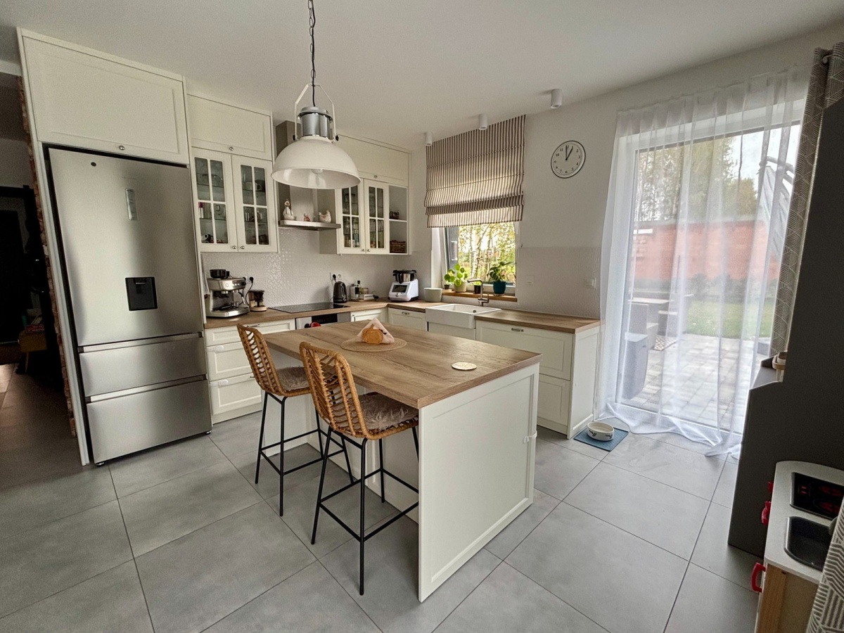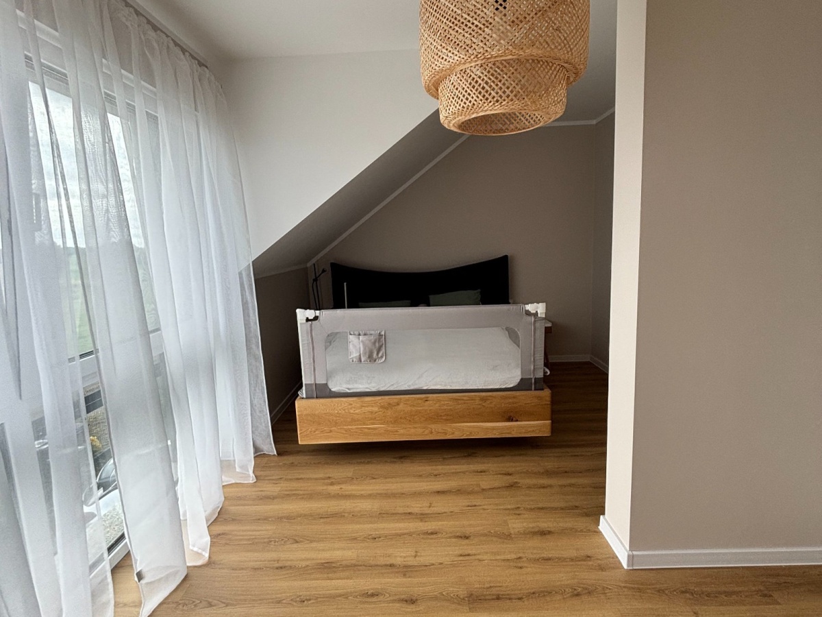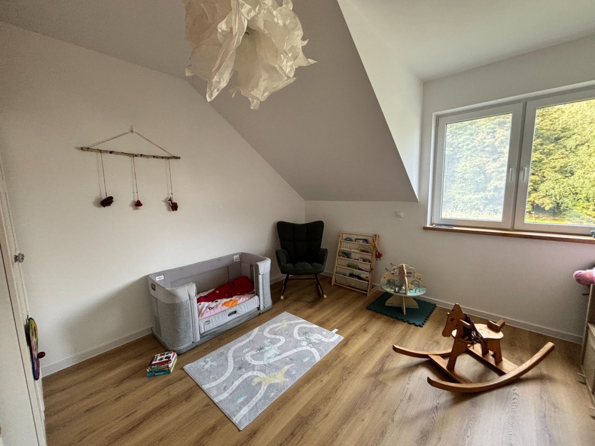 Największym atutem domu są wyjątkowe widoki – z przestronnego salonu rozciąga się kojąca panorama lasu, zapewniająca ciszę i pełną prywatność, natomiast z sypialni można podziwiać otwarte, malownicze pola, które tworzą poczucie przestrzeni i kontaktu z naturą.