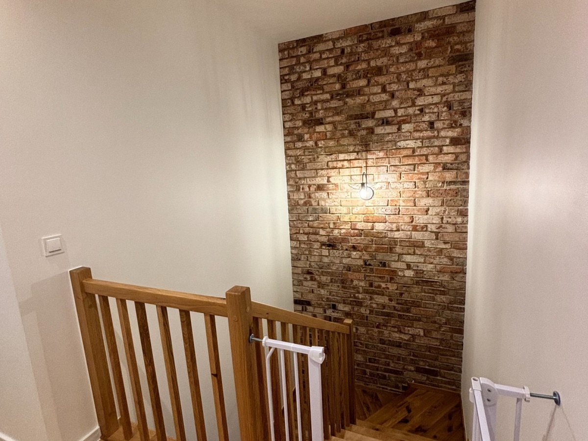 Schody i balustrady i parapety wykonane są z drewna dębowego. Na całym parterze znajdują się jednolite płytki, a na piętrze panele firmy Quickstep. Wszystkie drzwi w domu są ramowe firmy DRE. W salonie, przedpokoju i na klatce schodowej położona jest cegła rozbiórkowa . Klimatu w salonie dopełnia kominek Schiedel Sargas 1. Okno tarasowe przesuwne Smart slide o długości 300 cm. Kuchnia jest zrobiona na wymiar, wyposażona w sprzęt premium marki Haier, oraz Hisense. Dodatkowym autem jest zabudowana szafa w przedpokoju oraz garderoba robiona na wymiar.