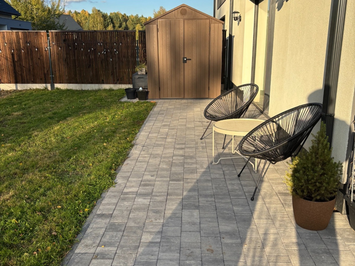 Kostka brukowa znajduje się na podjeździe, obejściu domu oraz tarasie (ponad 30 m2). Brama polisadowa 5 m z automatykę NICE.