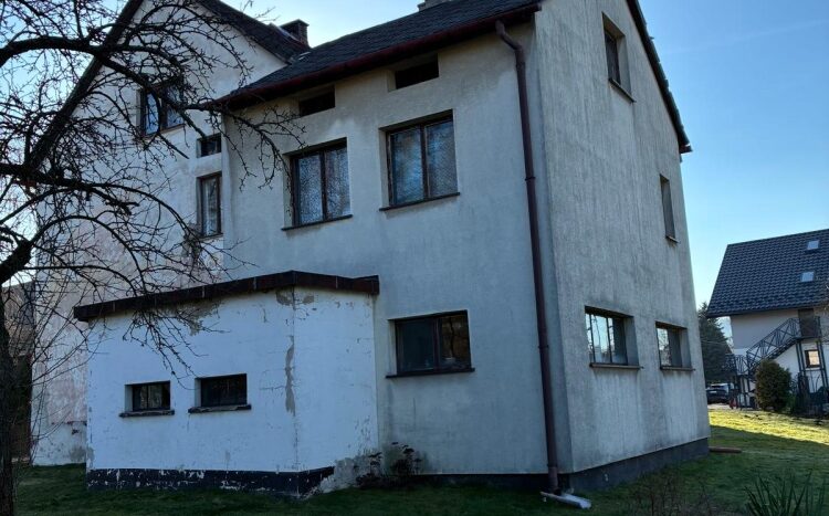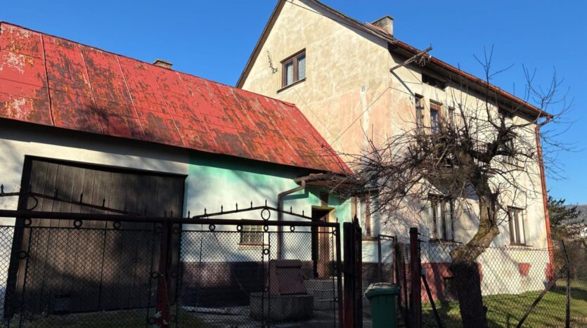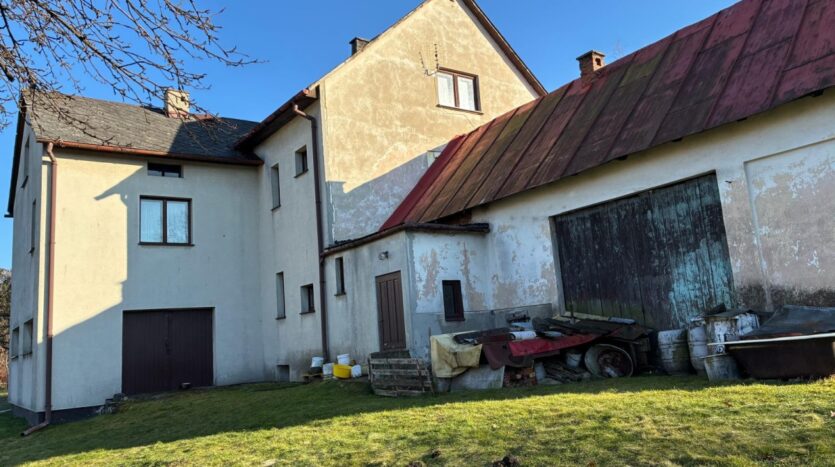 Budynek murowany pod dachem z konstrukcji drewninej pokryty eternitem płaskim.Do budynku mieszkalnego przybudowany budynek gospodarczy murowany kryty blachą