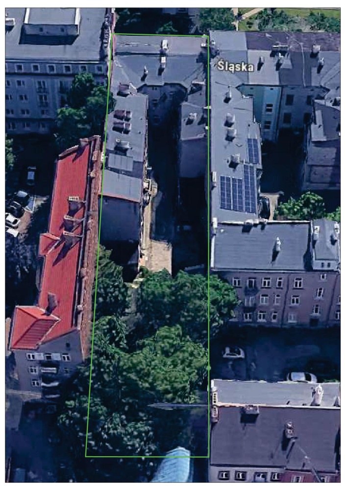 Wjazd od ulicy Śląskiej. W podwórzu miejsca parkingowe.