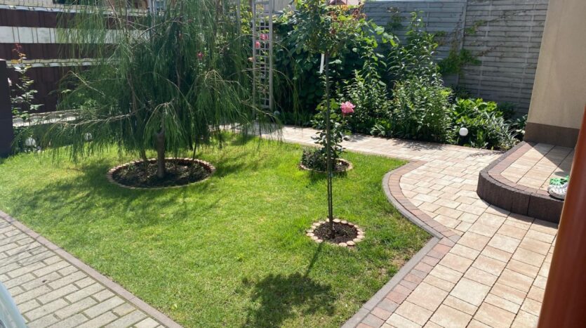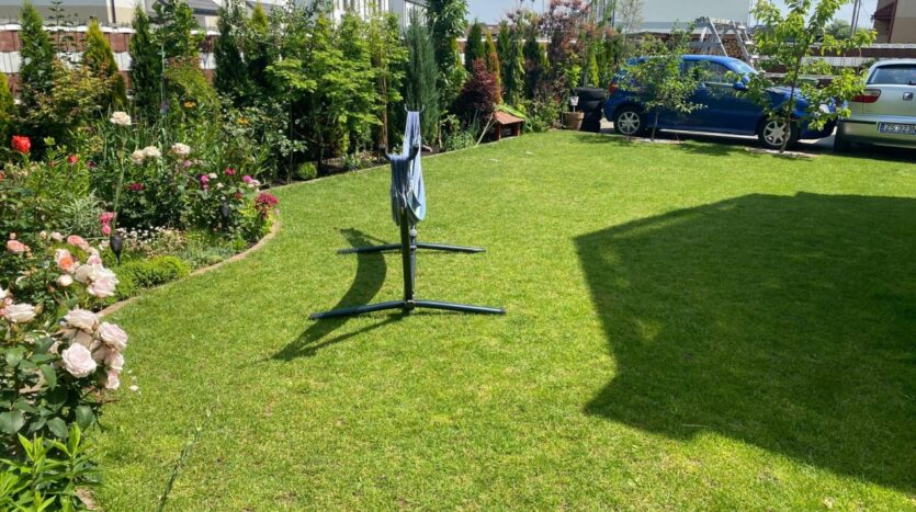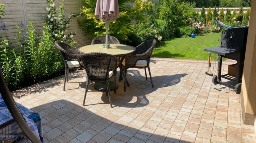 Posesja jest ogrodzona (brak jedynie bramy-wszystkie instalacje podprowadzone) i posiada podjazd na conajmniej trzy samochody. Niewątpliwym walorem jest piękny i zadbany ogród który jest oczkiem w głowie Pani domu. Znajdziemy tam piękne róże, kwitnące krzewy, drzewka owocowe oraz inne rośliny i kwiaty na rabatach. Taras usytuowany z tyłu domu pośród drzew co daje poczucie prywatności i spokoju. Osobno niewielka drewutnia. Garaż w bryle budynku z napięciem 440V oraz woda i prąd wyprowadzona na zewnątrz budynku do ogrodu. W ogrodzie znajduje się również rozprowadzona instalacja pod oświetlenie ogrodowe włączane z domu oraz podziemny zbiornik na deszczówkę (2000l)z pompą – przydatna do podlewania ogrodu. Monitoring posesji z poziomu aplikacji na urządzeniu mobilnym.