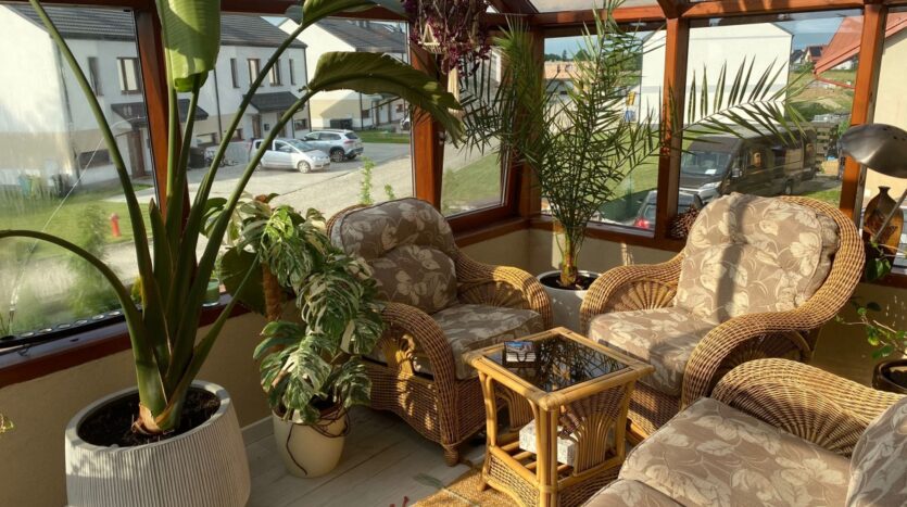 Na parterze znajduje się przestronny salon z kominkiem, połączony z nowoczesną kuchnią. Znajduje się tu też niewielki przedpokój oraz toaleta i pomieszczenie gospodarcze, które dodatkowo zaadoptowano na pralnie. Na piętrze trzy sypialnie w tym jedna z wydzieloną garderobą oraz jedna z zabudowanymi szafkami w skosie. Podwieszane sufity z dodatkowym oświetleniem LED w pokojach, salonie, łazience, toalecie oraz w przedpokoju. Dodatkowo ogromnym atutem jest ogród zimowy który tworzy niepowtarzalny klimat zarówno zimą jak i latem. Istnieje możliwość zaadoptowania tego pomieszczenia na dodatkową sypialnię bez dodatkowych pozwoleń i ingerencji w strukturę budynku. Poddasze(strych)nieużytkowe, ocieplone i wykończone płytami OSB(służy jako dodatkowa przestrzeń magazynowa).