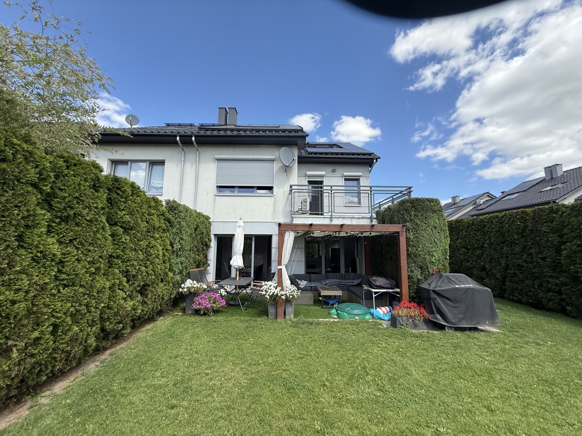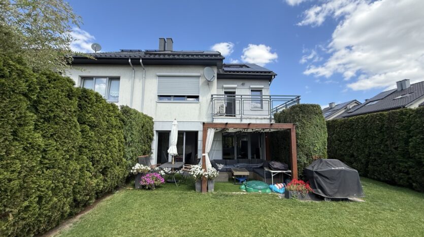 Dużym atutem jest zadbany ogród z drewnianą pergolą oraz nowym, automatycznym systemem nawadniania sterowanym przez Wi-Fi (Rainbird) oraz założonym w 2025 roku trawnikiem Dodatkowo wysokie tuje zapewniające prywatność. Południowo – zachodnia ekspozycja salonu i ogrodu – nasłonecznienie przez cały dzień.