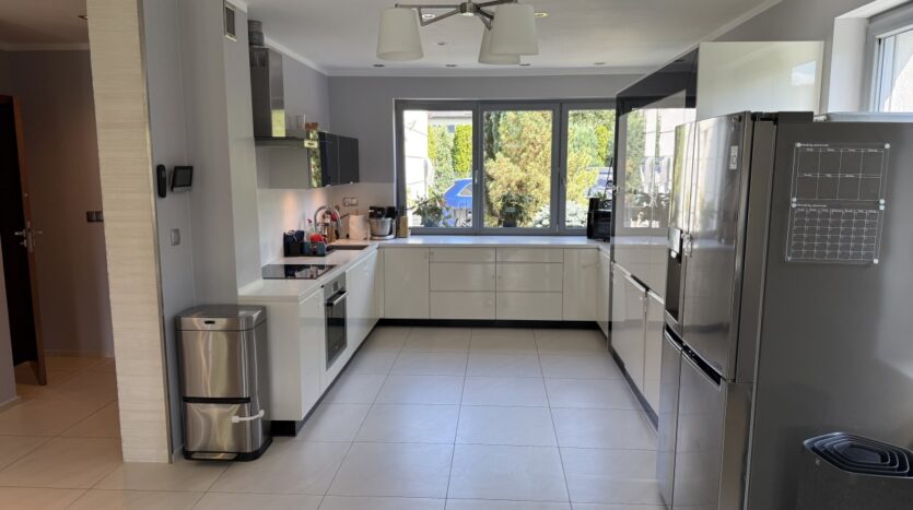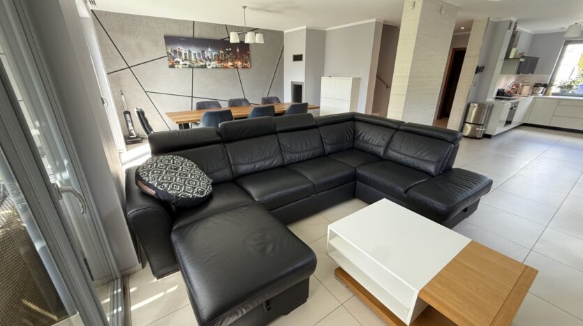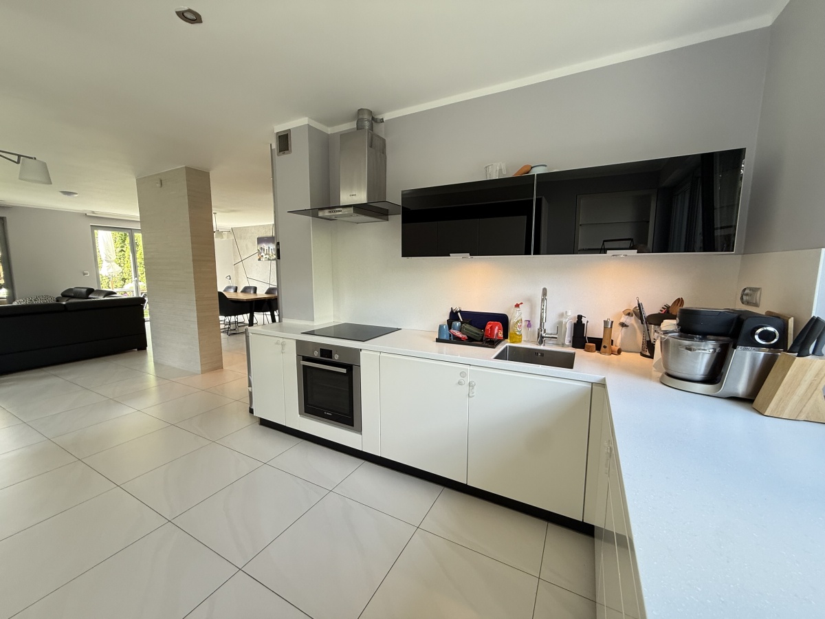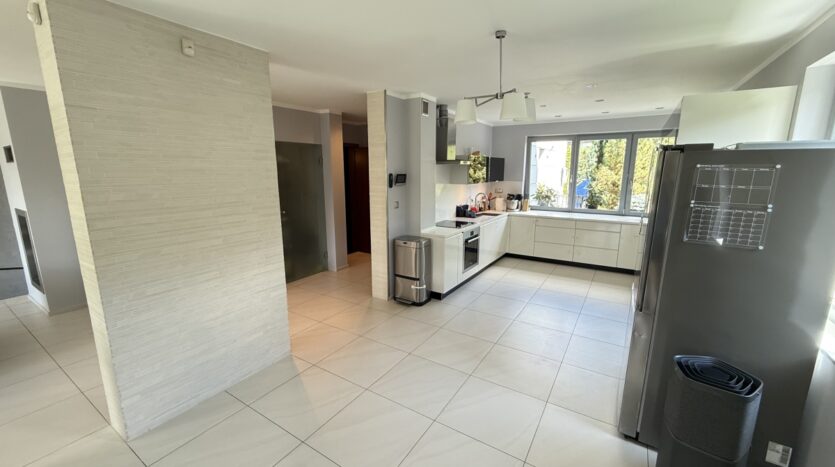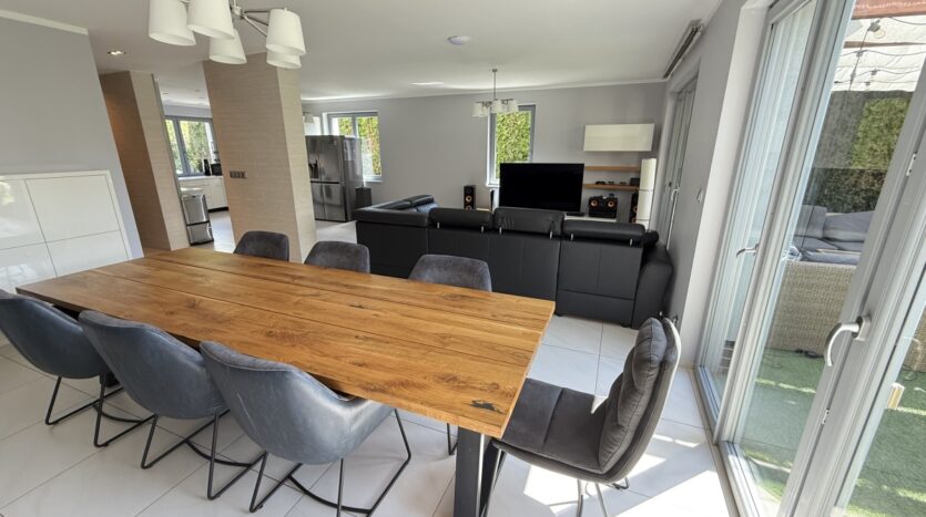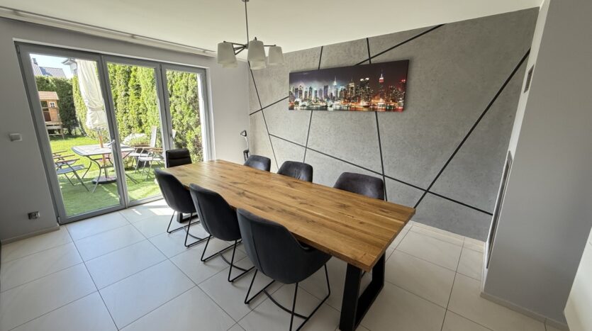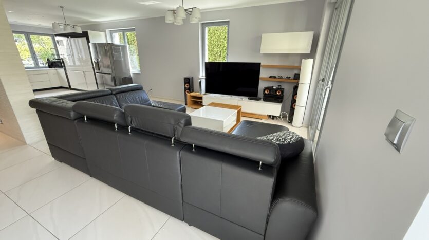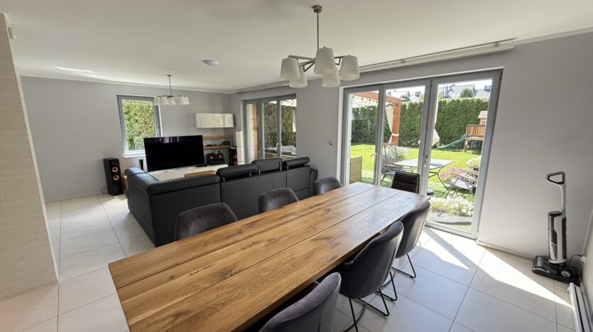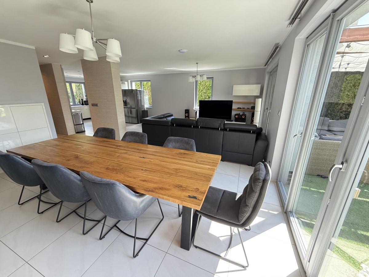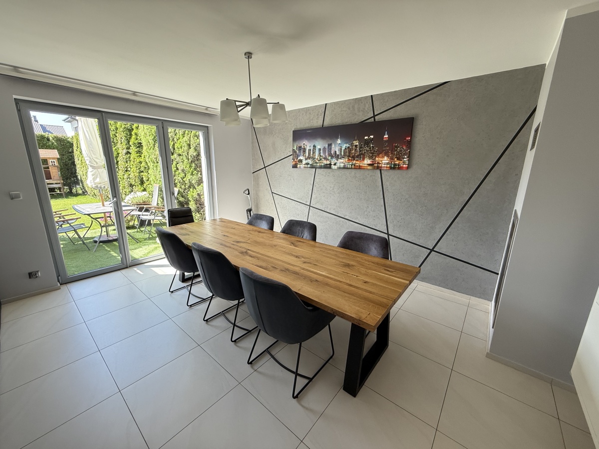 Dom wyróżnia się wysoką jakością wykończenia i nowoczesnym designem. W 2025 roku odświeżono wnętrza – pomalowany parter, piętro oraz klatka schodowa. W całym domu działa bezprzewodowy internet Wi-Fi oparty na architekturze UniFi (5 punktów dostępu Ubiquiti U7 PRO), a monitoring zarówno zewnętrzny jak i wewnątrz zapewnia bezpieczeństwo domowników.