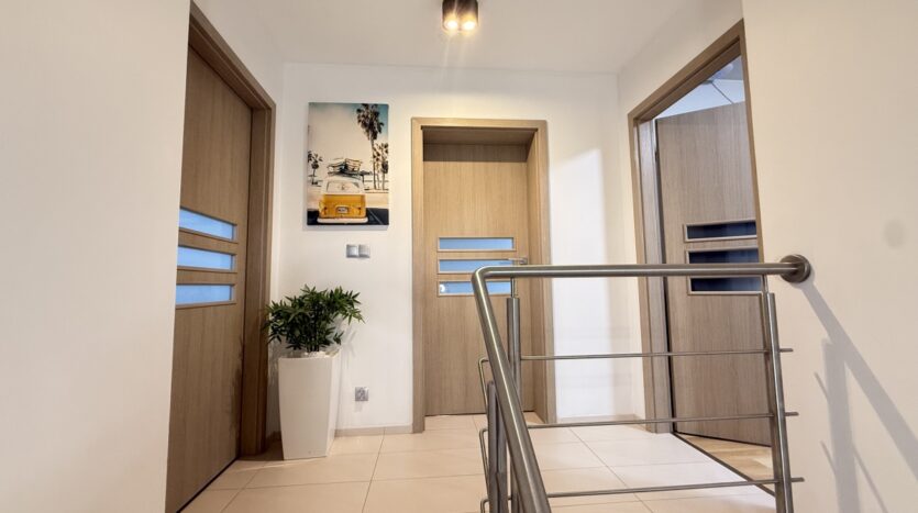 Piętro (70,29 m²): trzy sypialnie (w tym główna 17,77 m²) oraz komfortowa łazienka (14,5 m²). W sypialni oraz w jednym z pokoi klimatyzacja. W każdym z pokoju zabudowana szafa.