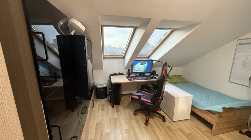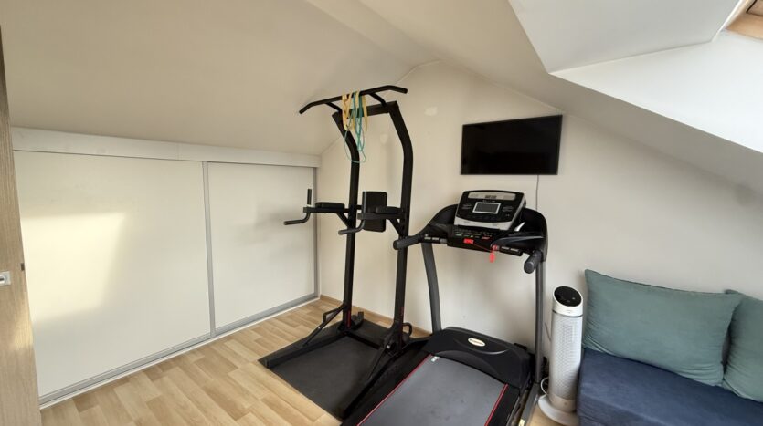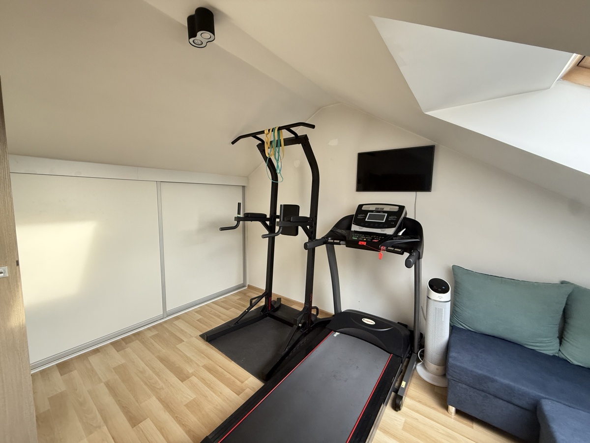Poddasze (26,73 m²): klimatyzowany gabinet , pralnia oraz dodatkowy pokój (obecnie siłownia) wraz z zabudowaną szafą – idealna do przechowywania artykułów sezonowych.