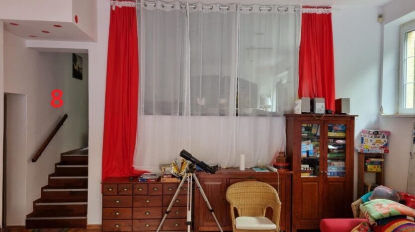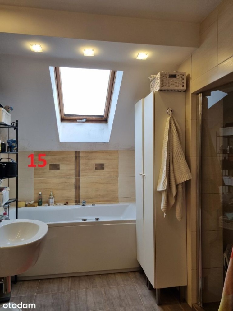 8. Opis techniczny – Materiał budynku: cegła – Dach dwuspadowy, z dachówki ceramicznej. Ogrzewanie: gazowe – Media: prąd, woda, gaz, kanalizacja – Okna plastikowe trzyszybowe wymienione w 2022r. w głównej części; dwa garaże, piwnica
