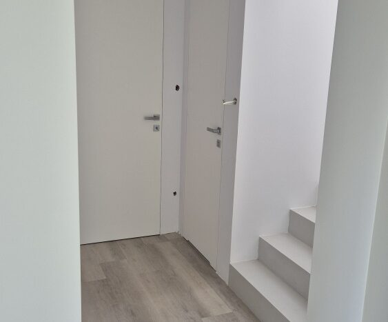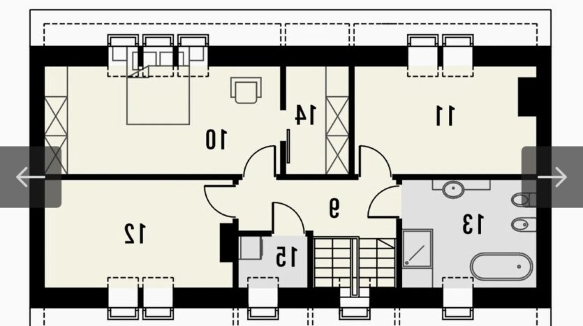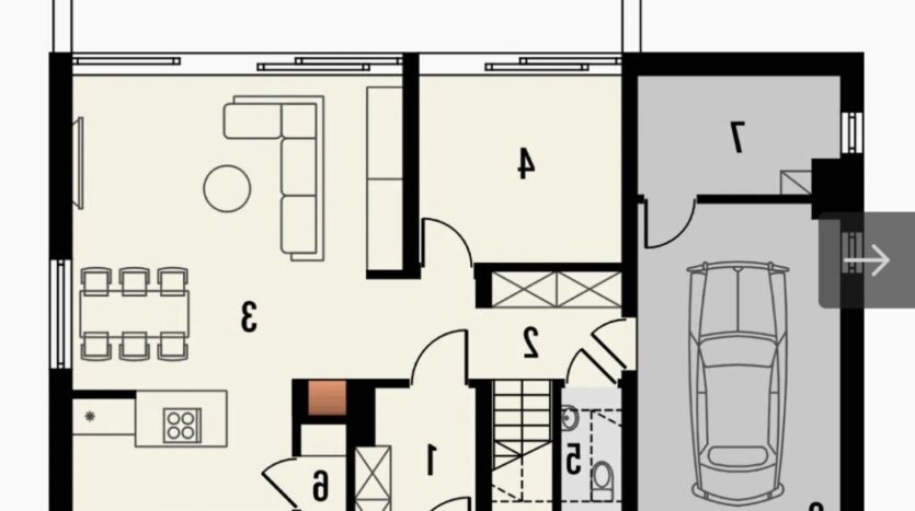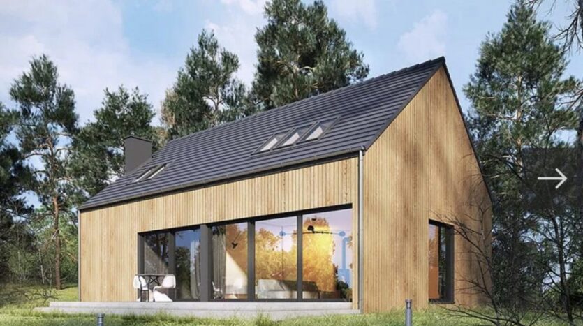 Nowoczesna bryła typu stodoła, duże przeszklenia, garaż w bryle budynku. Na parterze salon z kuchnią, dodatkowy pokój i WC; na poddaszu 3 sypialnie, łazienka, garderoba i pralnia.