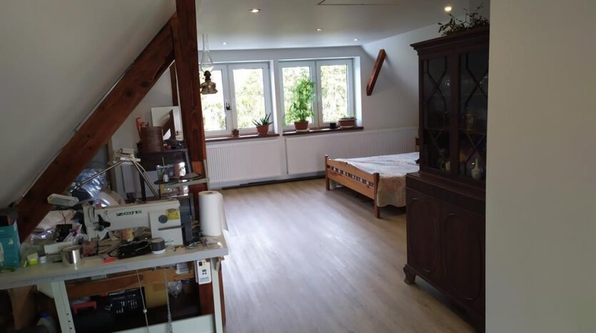 Piętro 43m – Otwarta przestrzeń wypoczynkowa z sypialnią, łazienką 7,2m. z wanną, dużym zadaszonym tarasem 6,8mx2,8m (18m). od południowej strony z widokiem na jezioro i las.