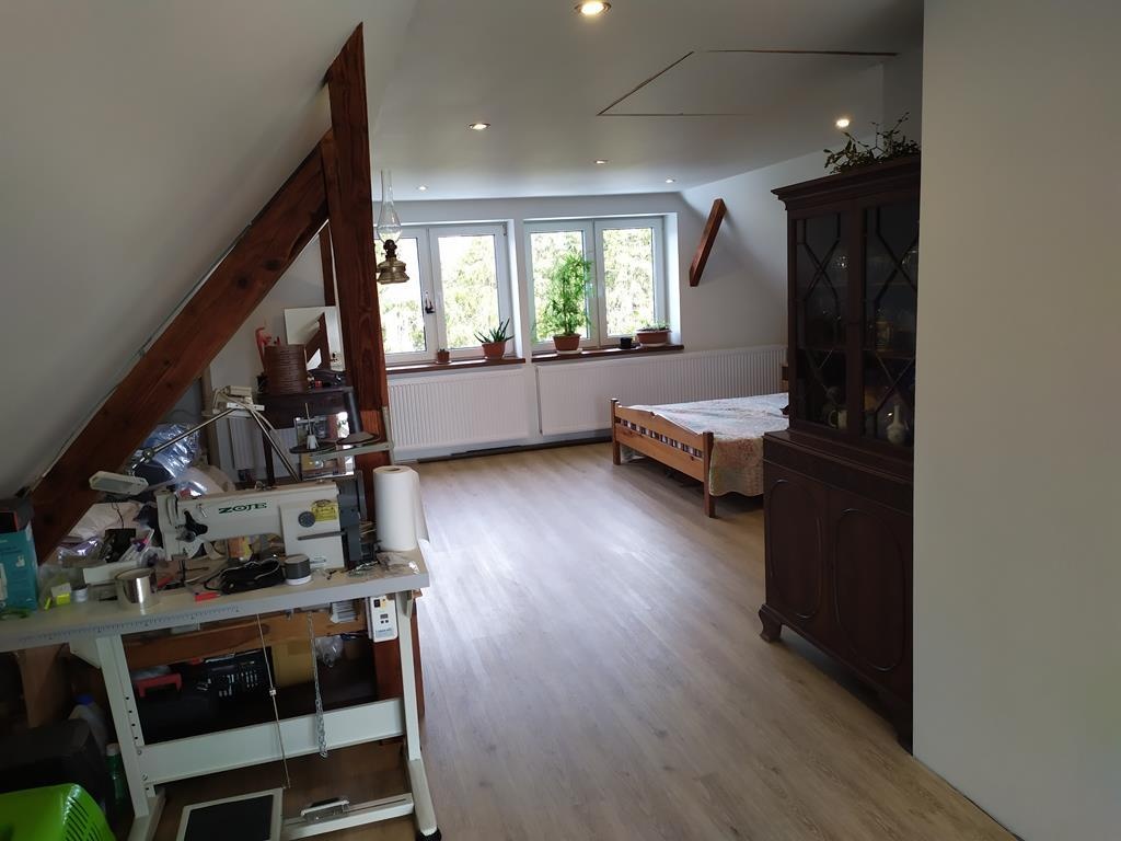 Ocieplony styropianem 15/20 cm grubości. Nowy dach pokryty blachodachówką, ocieplony pianą Pur o grubości 28 cm. Nowe posadzki pokryte panelami winylowymi. Nowe okna trzyszybowe i ciepłe drzwi. Nowa hydraulika i elektryka, nowe grzejniki o bardzo dużej powierzchni ze względu na ekonomię ogrzewania pompą ciepła.