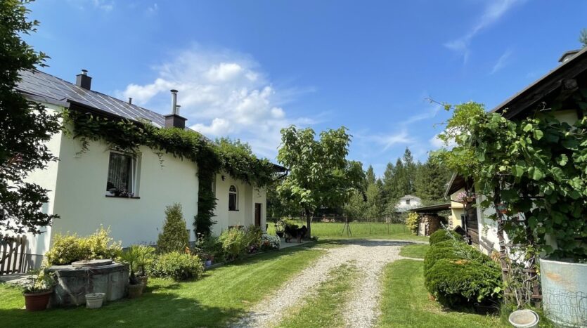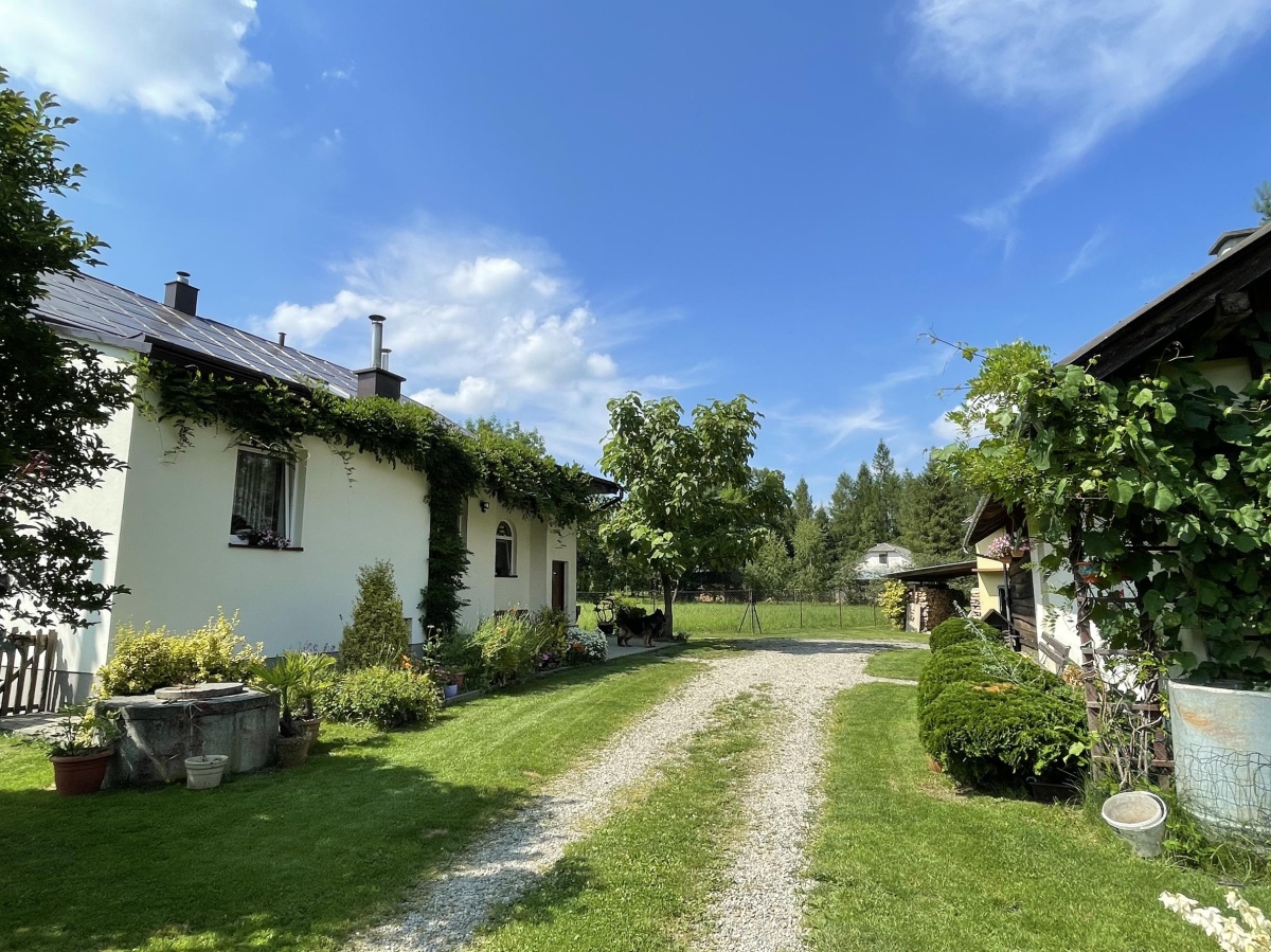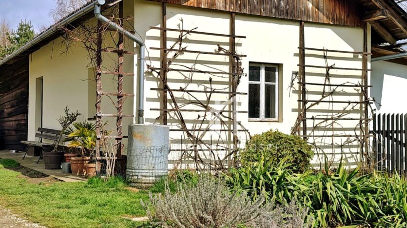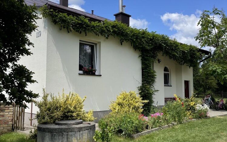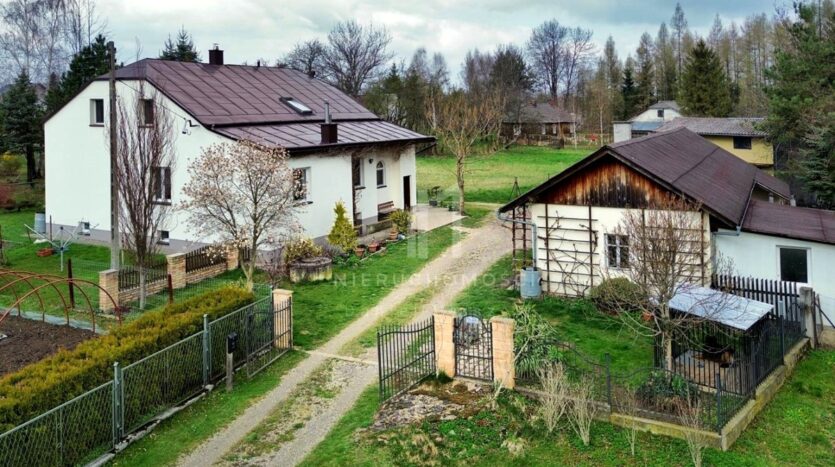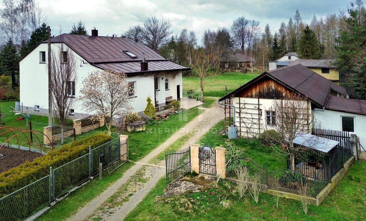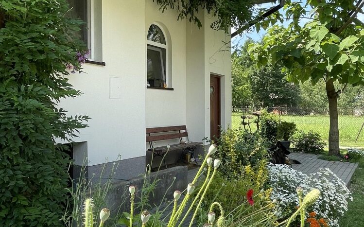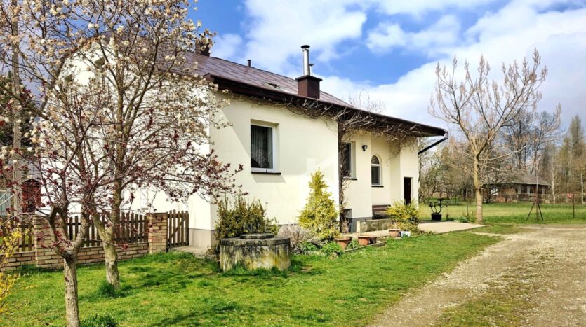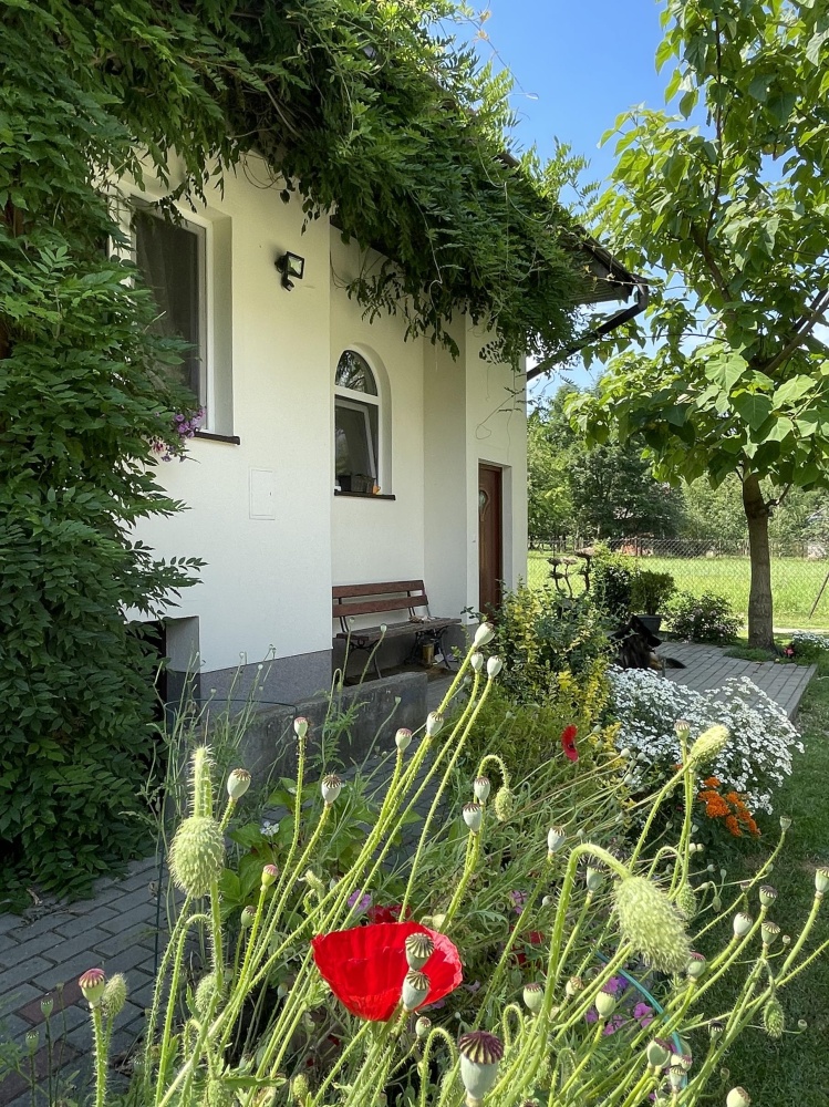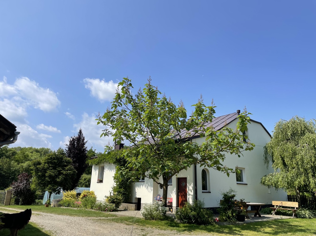 Z okien domu rozpościera się malowniczy widok na ogród z licznymi krzewami i drzewami ozdobnymi, a nieco dalej dostrzegamy ścianę lasu, a z drugiej strony otwarte pola – jednym słowem panuje tu sielankowy klimat zacisza natury.