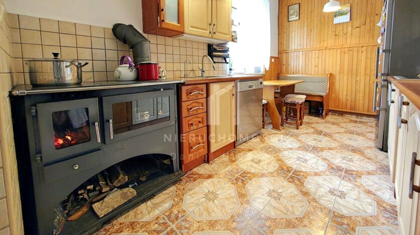 – klimatyczną kuchnię z pełnym wyposażeniem oraz charakterystycznym piecem kuchennym na drewno,