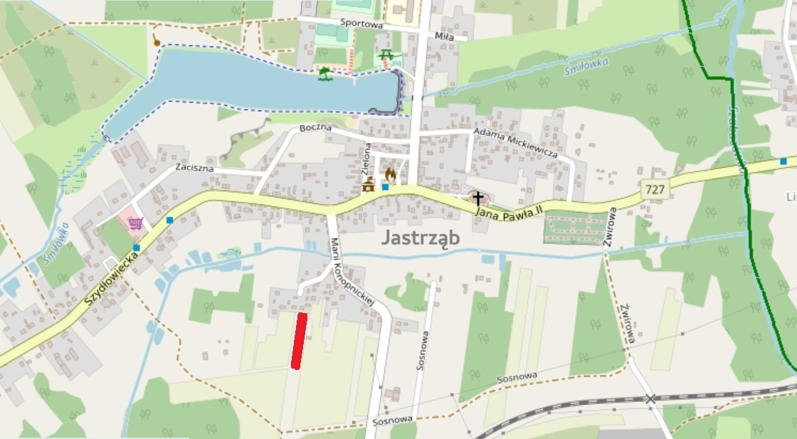 Położenie w cichej okolicy, w granicach miasta Jastrząb, przy ulicy Konopnickiej, w pobliżu zabudowy jednorodzinnej.