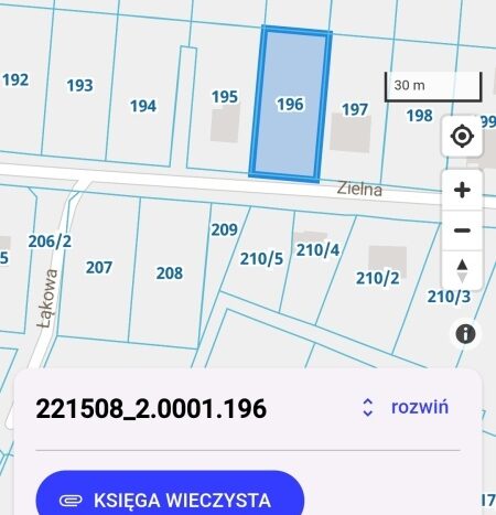 Numer ewidencyjny: 196, klasa gruntu: Vb, wymiary działki 20 m x 45m.