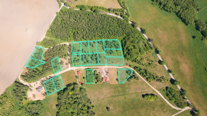 Działki są częściowo zalesione. Na każdej znajduje się od 5 do 15 drzew, głównie brzóz. Są to 20-30 letnie samosiejki, a więc już dorodne drzewa. W razie potrzeby mogą zostać usunięte, ale gorąco namawiam do ich przynajmniej częściowego pozostawienia. Drzewa stwarzają niepowtarzalny klimat. Domek w otoczeniu drzew to kwintesencja relaksu.