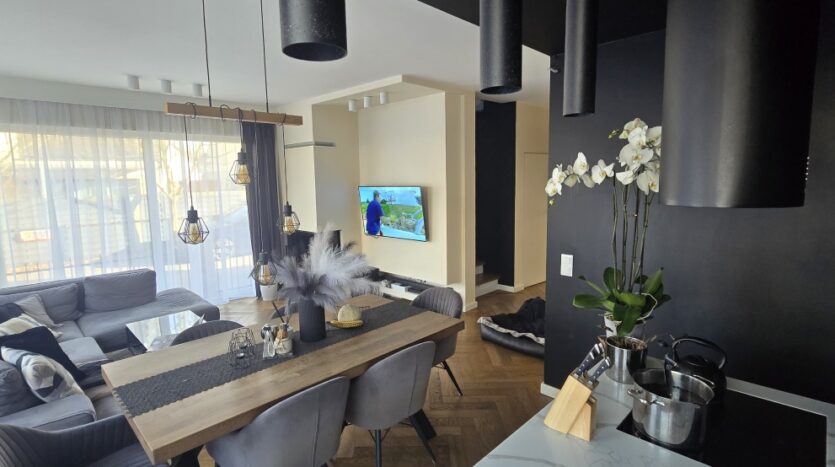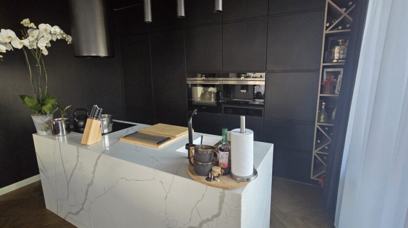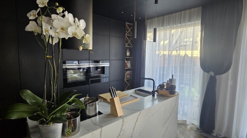 Kuchnia wykonana na indywidualne zamówienie z wyspą z konglomeratu stanowi centralny punkt domu – efektowna wizualnie, a jednocześnie niezwykle funkcjonalna. Cały parter objęty jest ogrzewaniem podłogowym, co zapewnia wysoki komfort użytkowania.
