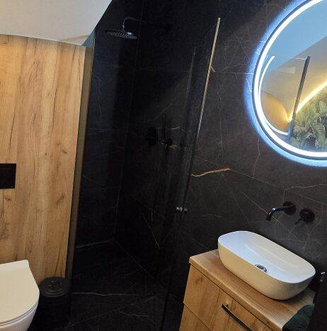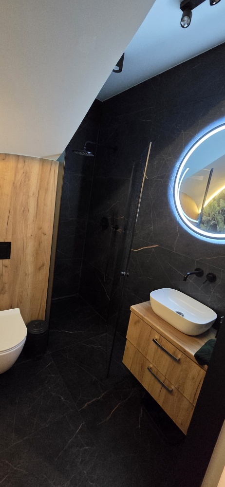 Łazienka na piętrze została zaprojektowana jako prawdziwa domowa strefa relaksu. Oprócz przestronnego prysznica typu walk-in znajduje się tu również wanna – idealna na wieczorny odpoczynek po intensywnym dniu. Ogrzewanie podłogowe dodatkowo podnosi komfort użytkowania tej przestrzeni.