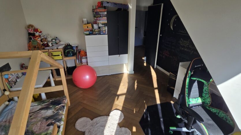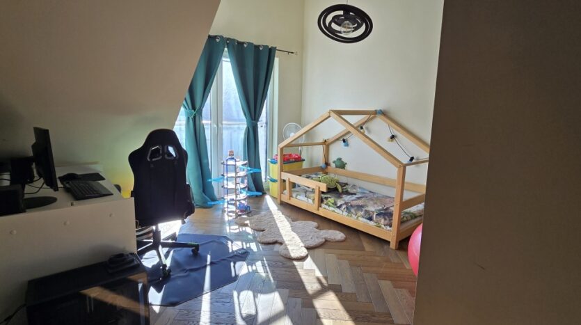 Na szczególną uwagę zasługują pokoje dziecięce – przestronne, jasne, z wysokimi sufitami i przytulnymi skosami. To wnętrza, które pozwalają dzieciom stworzyć własną, indywidualną przestrzeń do nauki, zabawy i rozwijania pasji. To dom, który naturalnie dopasowuje się do zmieniających się potrzeb rodziny.