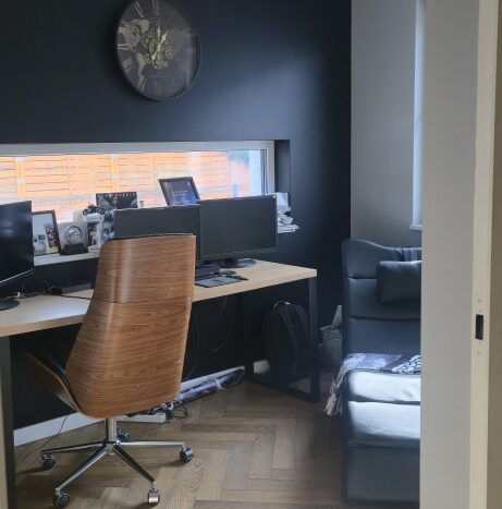 Na tym poziomie znajduje się również gabinet – komfortowa przestrzeń do pracy z domu, prowadzenia spotkań online lub stworzenia prywatnej biblioteki.