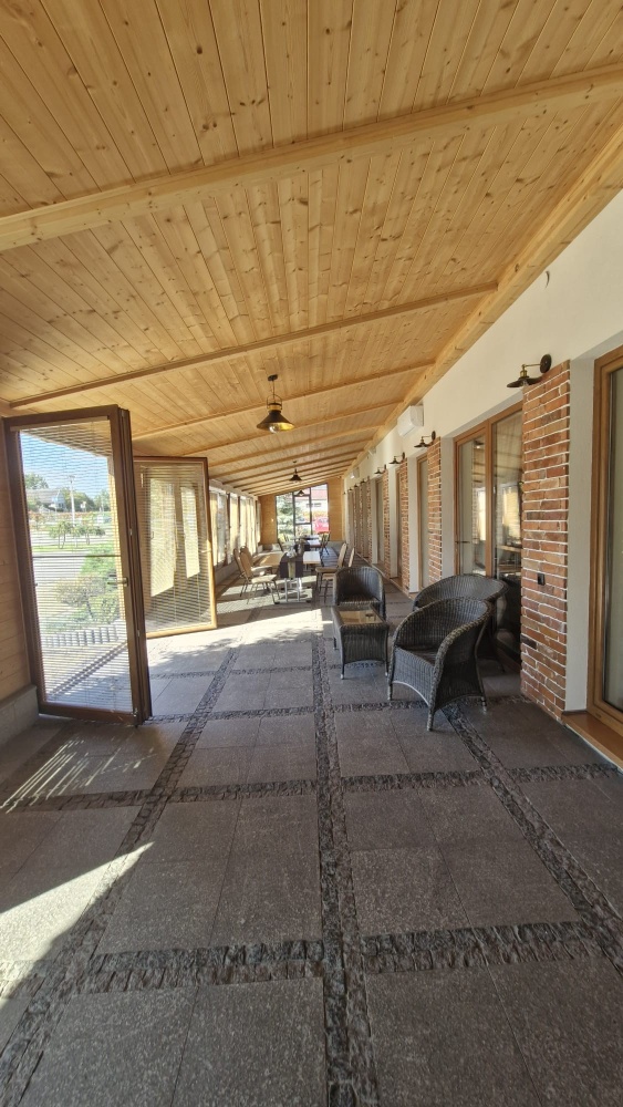 • Piętro: 18 pokoi dwuosobowych, sala konferencyjna, biuro, dwa tarasy