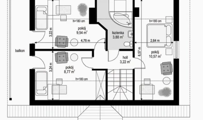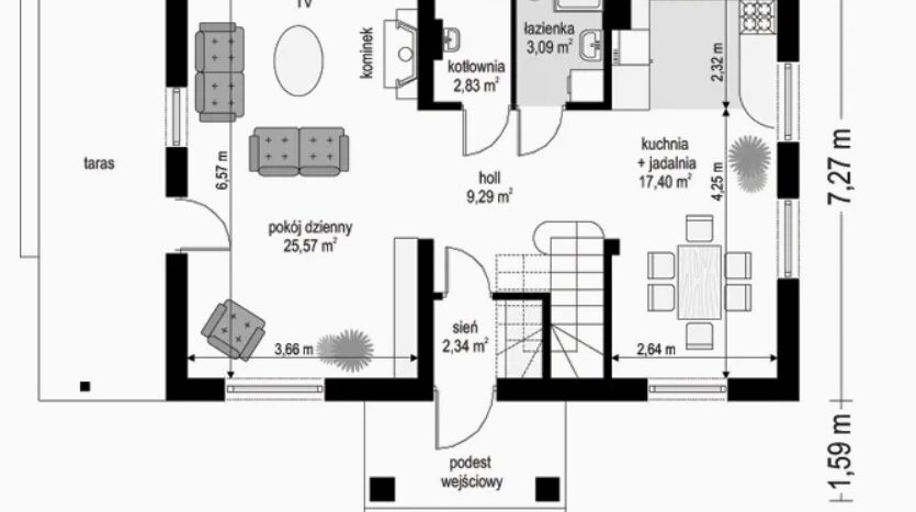 Dom główny: 3 sypialnie, 2 łazienki, salon, kuchnia i jadalnia oraz kotłownia.